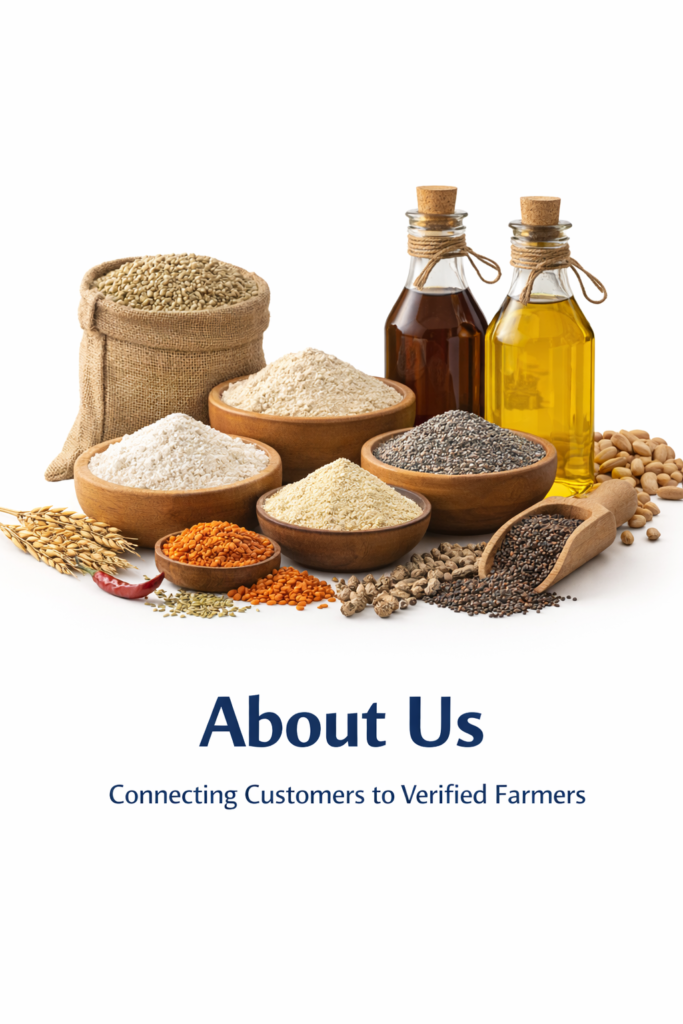 Farm grains, millets, flours, oils, legumes, spices, and value-added farm products sourced from verified farmers.
